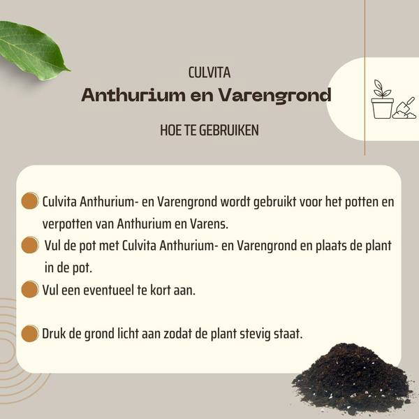 Culvita Anthurium- en Varengrond is geschikt voor het oppotten en verpotten van Anthuriums en Varens. Vul de pot met het mengsel, plaats de plant in het midden en vul rondom aan. Licht aandrukken is voldoende om de plant stevig neer te zetten.