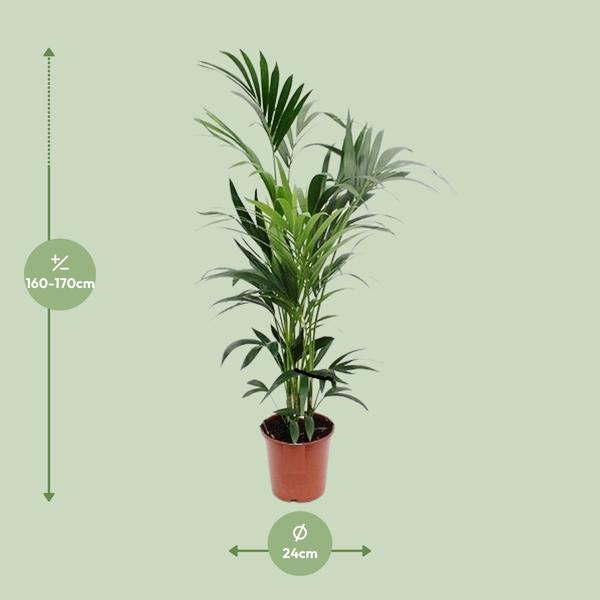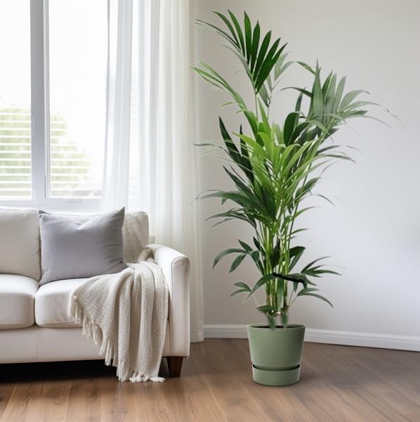 De Kentiapalm, of Howea forsteriana, zorgt voor een elegante uitstraling met zijn boogvormige, weelderige bladeren. Afkomstig van het paradijselijke Lord Howe Island, voelt deze palm zich uitstekend thuis bij jou in de woonkamer. Hij vraagt weinig onderhoud en verdraagt ook situaties met minder licht. Bovendien zuivert hij de lucht in huis, wat bijdraagt aan een gezonde leefomgeving.