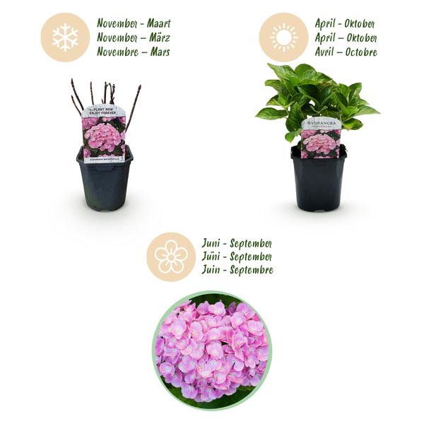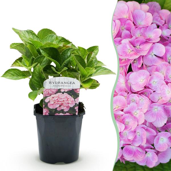 Hydrangea macrophylla Pink brengt kleur en leven in elke ruimte. De grote roze bloemen bloeien in de zomer, een echte eyecatcher voor de tuin of terraspot. Gemakkelijk te verzorgen en zeer veelzijdig. Planten kunnen van kleur veranderen afhankelijk van de pH van de grond, van roze tot paars.