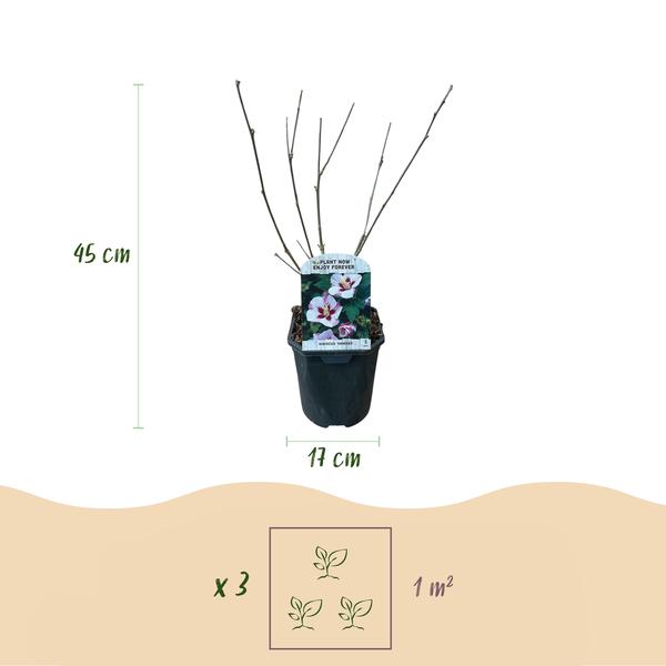 De Hibiscus syriacus Hamabo is een elegante struik die indruk maakt met zijn grote, lichtroze bloemen en witte bloemblaadjes met een roze hart. Deze veelzijdige plant bloeit van de zomer tot de vroege herfst en is een geweldige keuze voor zowel kleine als grote tuinen. Deze bladverliezende plant is onderhoudsvriendelijk, droogteresistent en trekt vlinders en bijen naar je tuin.
