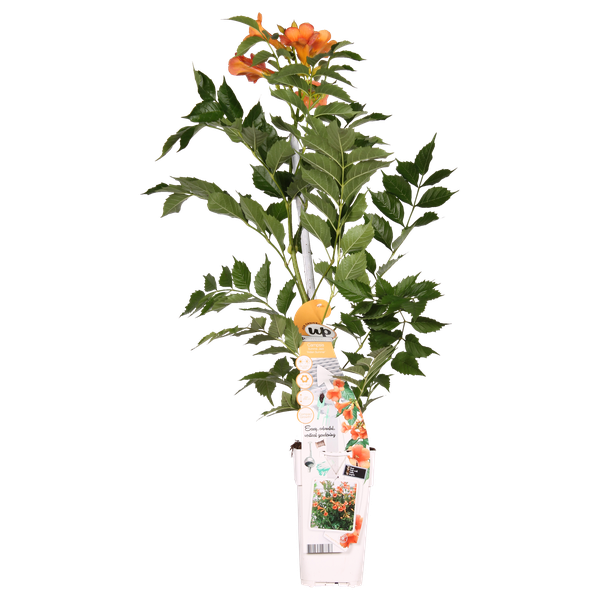 De Campsis Indian Summer trompetbloem betovert met zijn vurige oranje bloemen en brengt direct een vleugje vakantie naar je tuin. Hij is ideaal voor een zonnige, beschutte plaats waar hij volop kan bloeien in de late zomermaanden. De plant klimt omhoog met een krachtige groei en creëert een opvallend element in je tuin dat doet denken aan zonnige vakanties in het zuiden van Europa. De trompetbloem is redelijk winterhard, dus hij kan in de meeste Nederlandse tuinen overleven en blijven bloeien voor meerdere seizoenen.