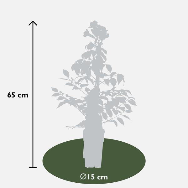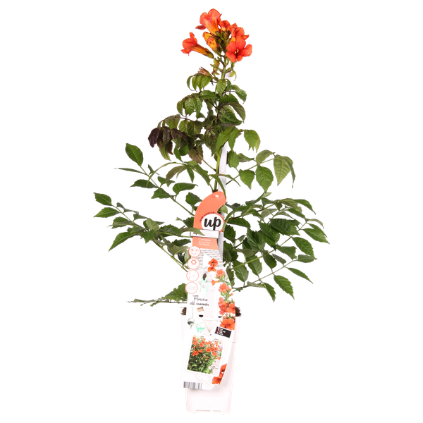 Deze krachtige klimmer, de Campsis Summer Jazz Fire Trumpet, brengt een warm accent in jouw tuin met zijn spectaculaire rode bloemen. Deze zelfhechtende trompetklimmer kan een hoogte van 3 meter bereiken en bloeit uitbundig tot in de late zomer. Hij is geschikt voor zonnige plekken en kan prima als struik groeien. Voor een volle groei kan deze plant wat ondersteuning zoals een klimrek gebruiken. Een aanrader voor iedereen die houdt van opvallende, exotische bloemen in de tuin.