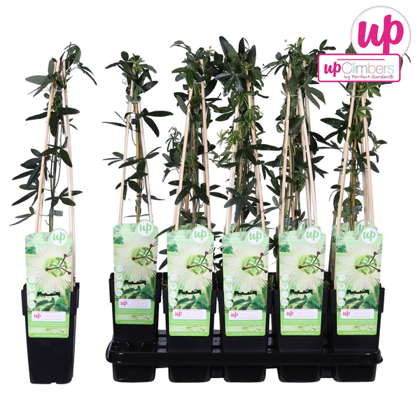 Passiflora wit caerulea Constance Elliot is een exotische klimplant die iedere tuin omtovert tot een tropisch paradijs. De ivoorwitte bloemen zijn aantrekkelijk en bloeien volop van juni tot september, vooral op warme en zonnige dagen. Deze passiebloem is ideaal voor je pergola, schutting of klimrek en voegt een vleugje avontuur en charme toe aan je buitenruimte. Hoewel het onderhoud vrij eenvoudig is, houdt hij van een zonnige en beschutte plek voor een optimale bloei.