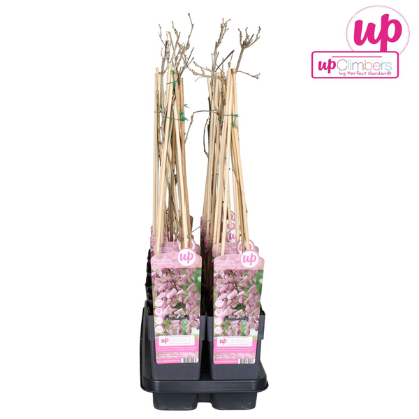 Wisteria floribunda Rosea, bekend als roze regen, biedt een exotische charme met zijn lange, hangende bloemtrossen. De plant bloeit rijkelijk in mei en juni, met soms een tweede bloei in september. Geschikt voor pergola’s en schuttingen. Deze snelle groeier kan wel 10 meter hoog worden en geeft je tuin een unieke uitstraling.