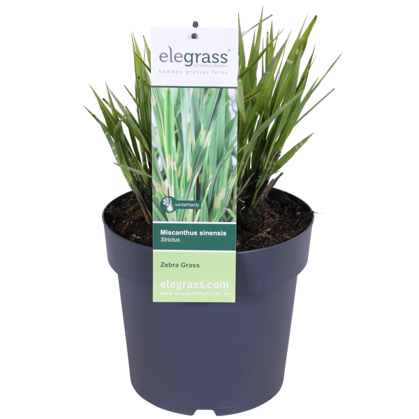 Miscanthus sinensis Strictus, of zebragras, valt op door zijn speelse groen-geel gestreepte bladeren. Dit siergras bereikt een hoogte van ongeveer 150 cm en bloeit in de nazomer met prachtige bronskleurige pluimen die sierlijk boven de bladeren uitsteken. Het is een sterke groeier en kan zowel in de volle grond als in een sierpot op het terras worden geplant. Perfect voor wie wat kleur en beweging aan de tuin wil toevoegen.